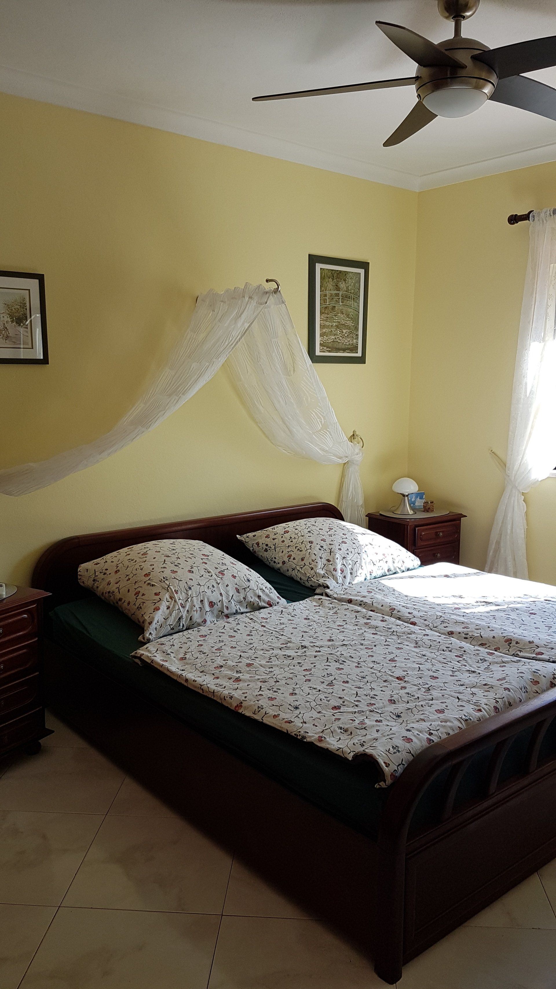 Il y a trois chambres disponibles, dont la première chambre a un lit double de 1,80mx 2m et sa propre salle de bain en suite (douche W/C, bidet). La chambre suivante a un lit double de 1,80 mx 2 m et la troisième chambre est meublée de deux lits simples de 0,90 mx 2 m. Toutes les chambres sont équipées de ventilateurs et de moustiquaires aux fenêtres.